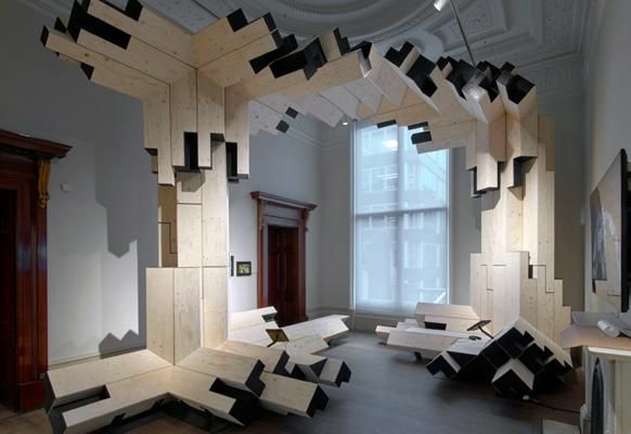 The London-based architect combined plywood with digital technology and augmented reality construction techniques, to design and install an interlocking wooden frame inside the Royal Academy's architecture gallery.