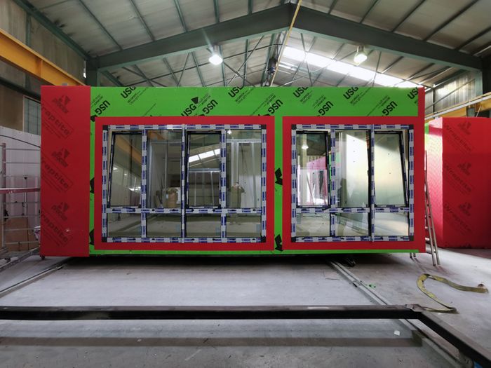 The self-adhesive membrane was applied in the factory, bonded externally to the exterior walls and roof. Ensuring the membrane was held firmly in place was critical to maintaining the quality of the system during ocean transportation and stacking at the construction site.