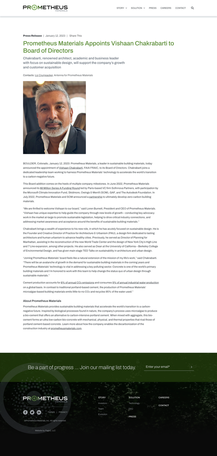 Prometheus Materials Appoints Vishaan Chakrabarti to Board of Directors